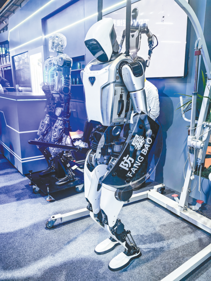中兵智能创新研究院有限公司(简称“创新院”)参展的三款人形机器人则为观众带来了精彩的现场演示,吸引许多观众驻足观看。据《环球时报》记者了解,此次创新院展出的三款人形机器人为伏羲机器人、伏羲Lite机器人以及安保机器人。伏羲机器人整机高180厘米,重85公斤,能够适应复杂环境中“摸爬滚打”的多模态机动需求,后续可重点面向巡逻值守、安防安保等特种场景开展部署应用。