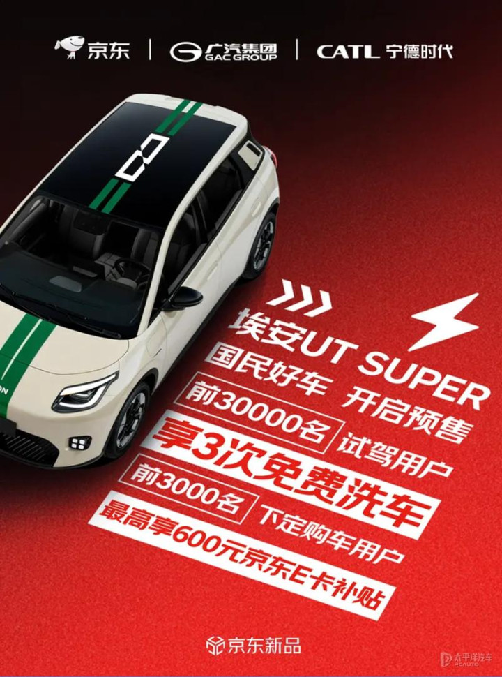 随着埃安UT super陆续下线,车辆预售、试驾也于当天全面启动。消费者可在京东APP搜索“国民好车”, 前3000名意向金用户可获赠最高600元京东E卡,直接用于补贴车款,同时还可参与价格竞猜互动,有机会抽取整车大奖。
